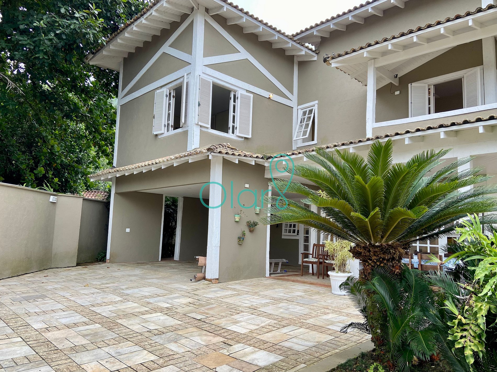 Na frente da casa existe um jardim com grama e as garagens para até 5 carros.