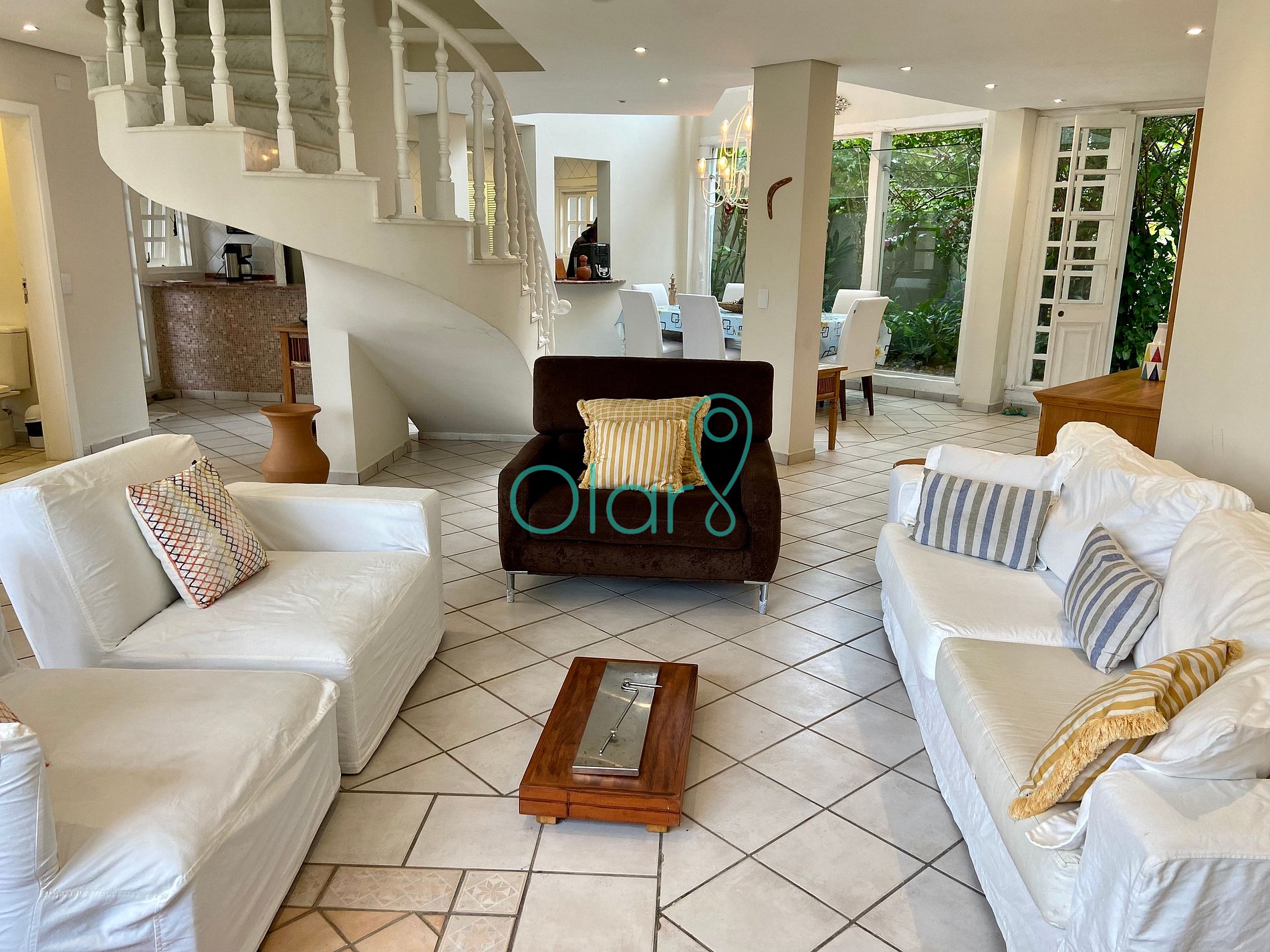 A sala de estar, jantar e TV são integradas com a cozinha no térreo.
