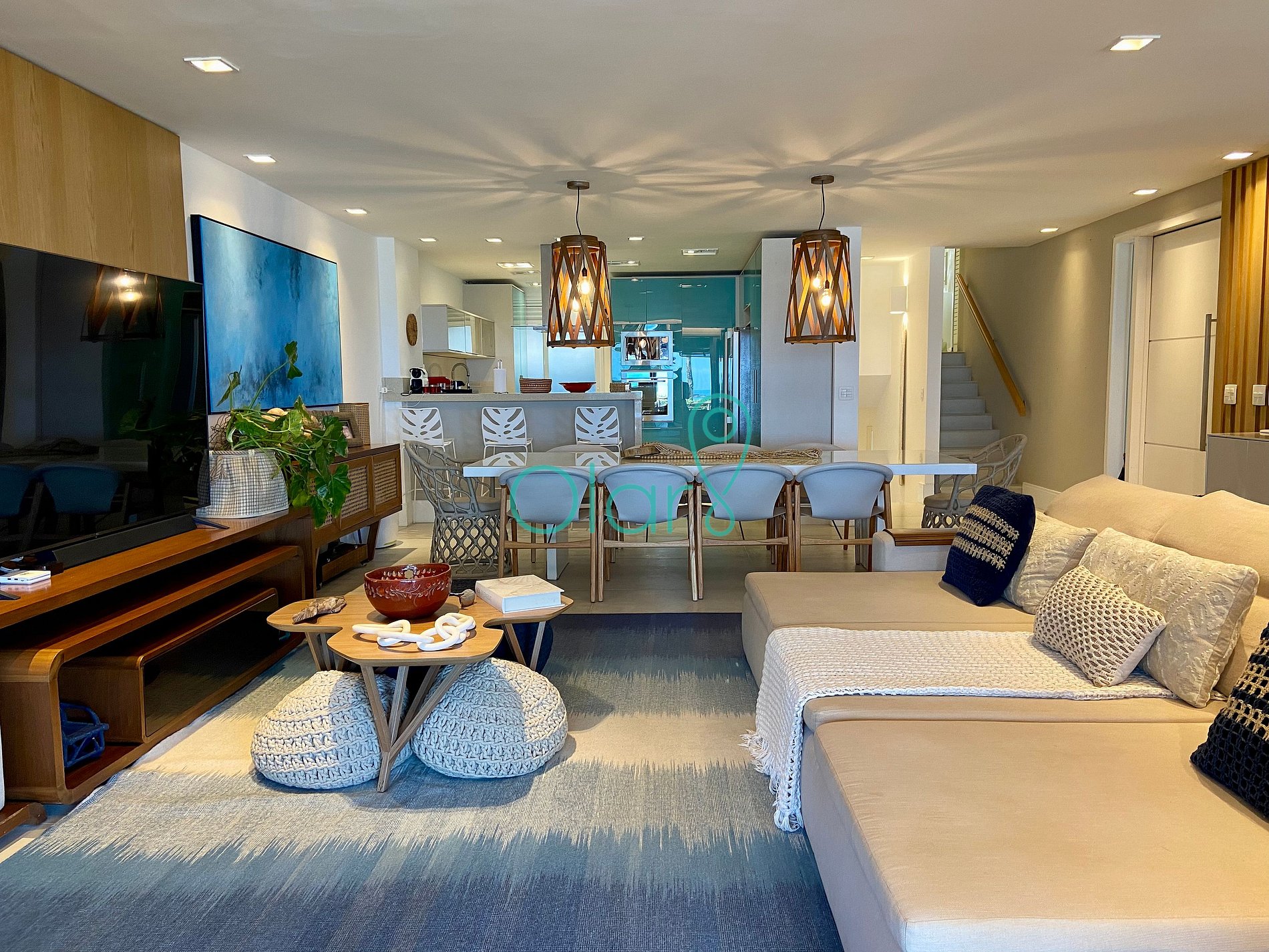 A sala é térrea, interligada com a varanda frontal para o mar. Possui 4 suítes, acomodando até 10 pessoas.