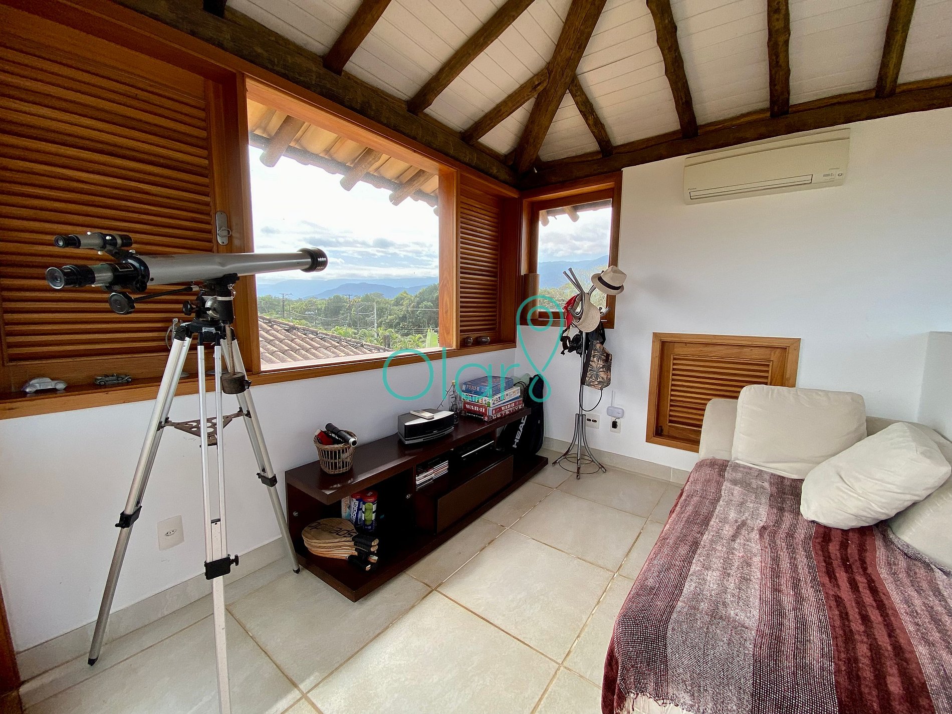 O pavimento superior possui 6 suítes, todas com ar condicionado e televisão.