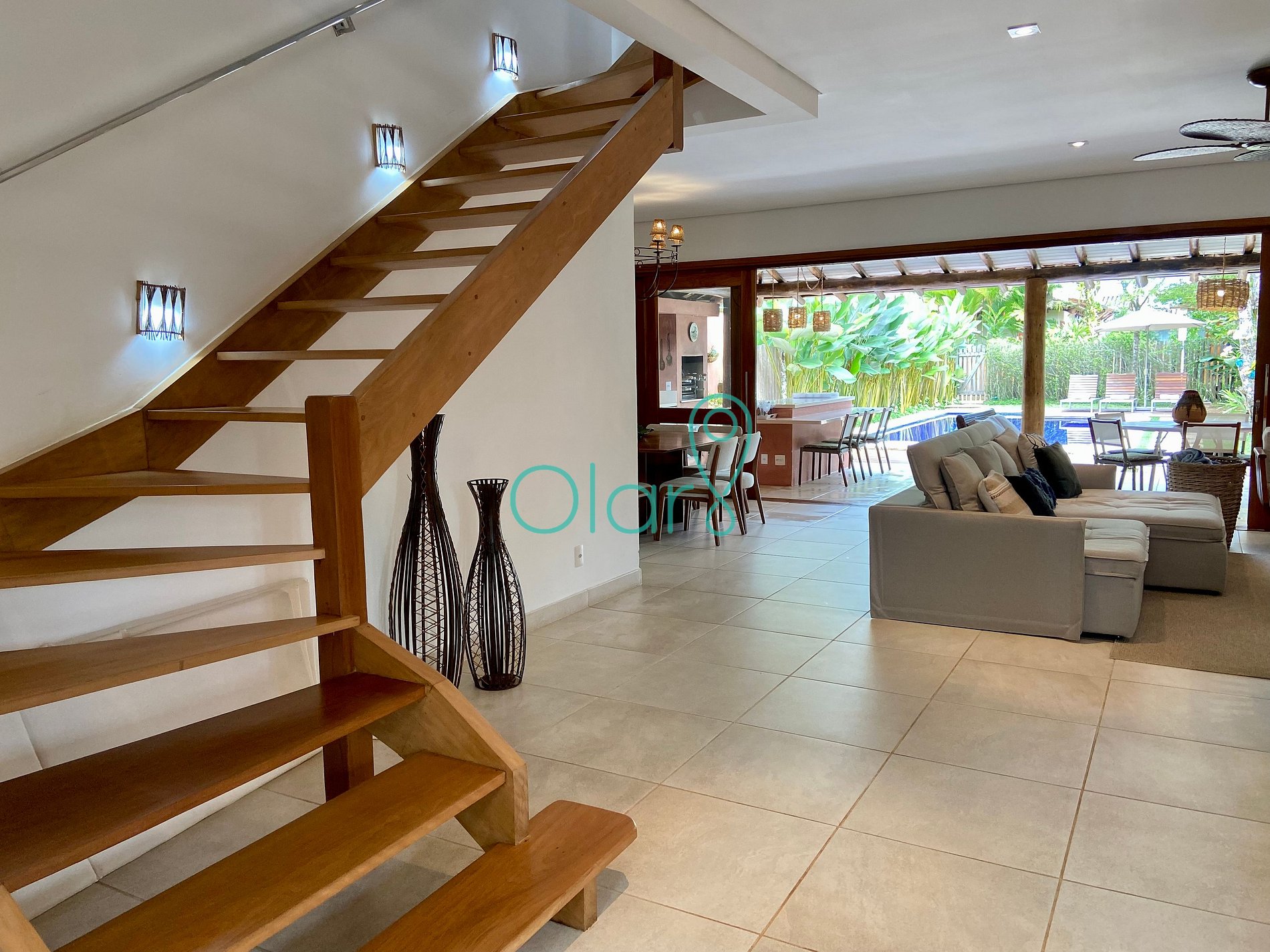 O pavimento térreo tem a sala, cozinha, varanda e churrasqueira todos integrados, criando uma ampla área de convívio e lazer, de frente para o quintal com a piscina privativa.