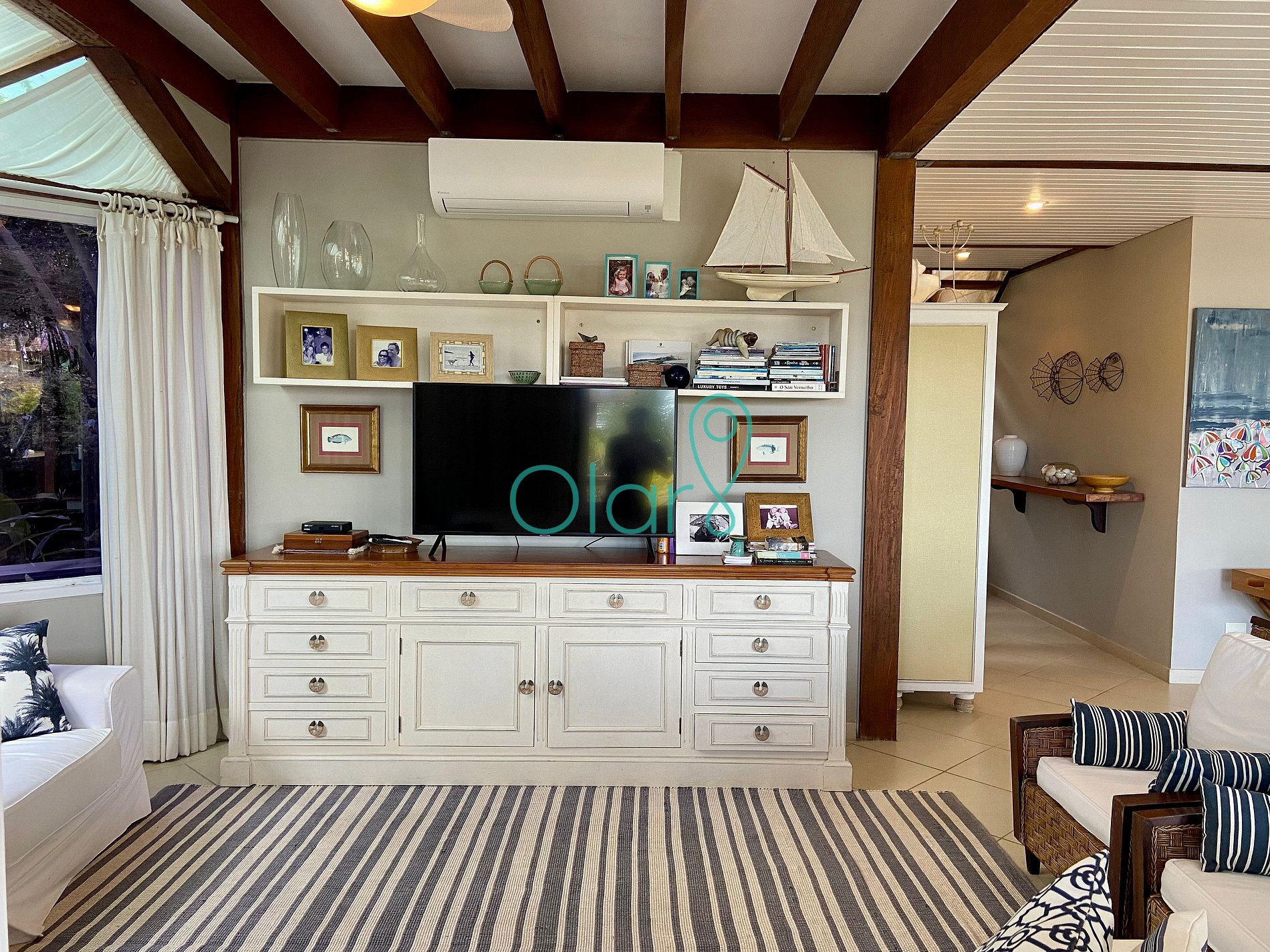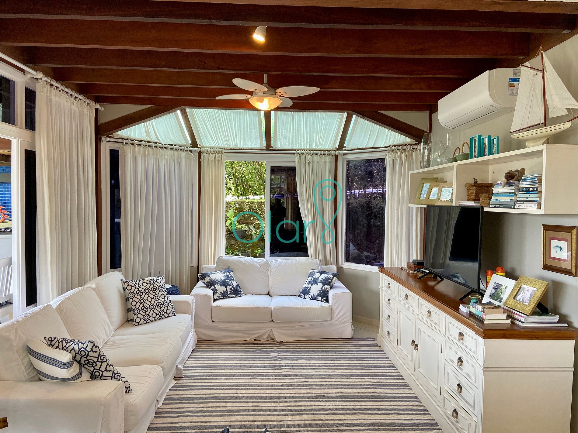 Sala de TV: ventilador de teto, ar condicionado, sofá de 3 lugares, sofá de 2 lugares, 2 poltronas, TV,