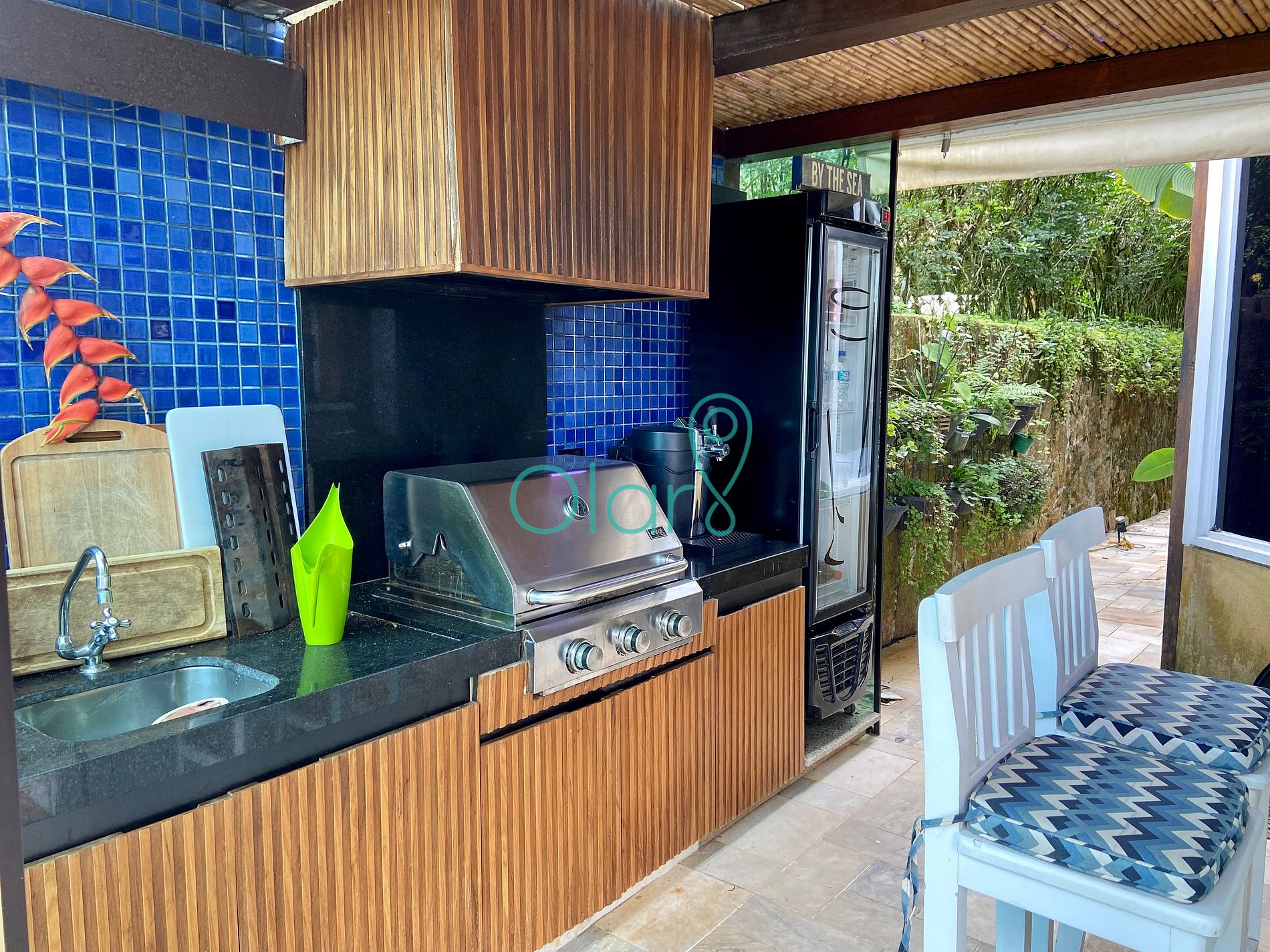 Churrasqueira: churrasqueira a gás Evol, pia, choppeira e uma geladeira.