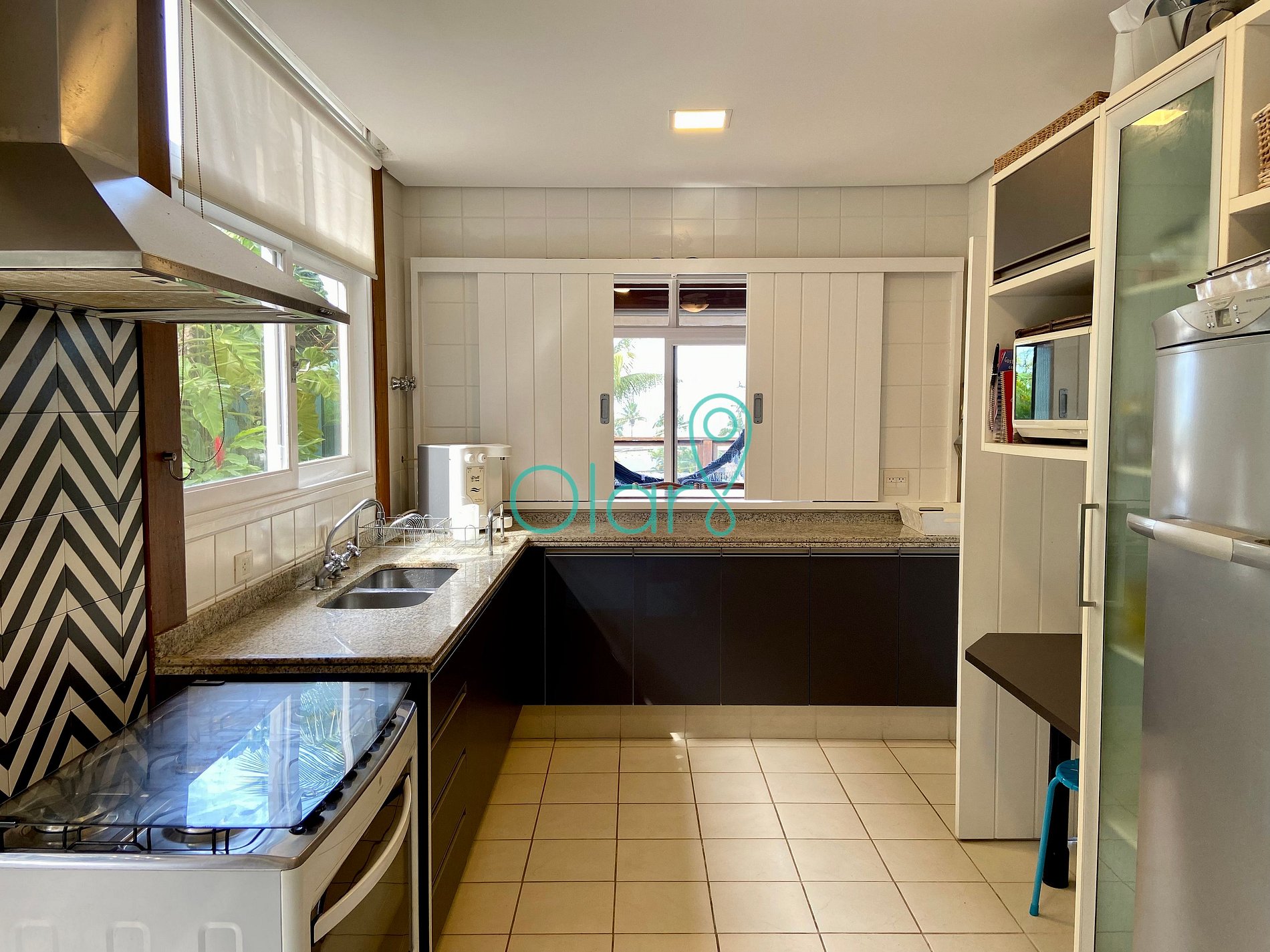 A casa é bem decorada e equipada com móveis, eletrodomésticos e utensílios.