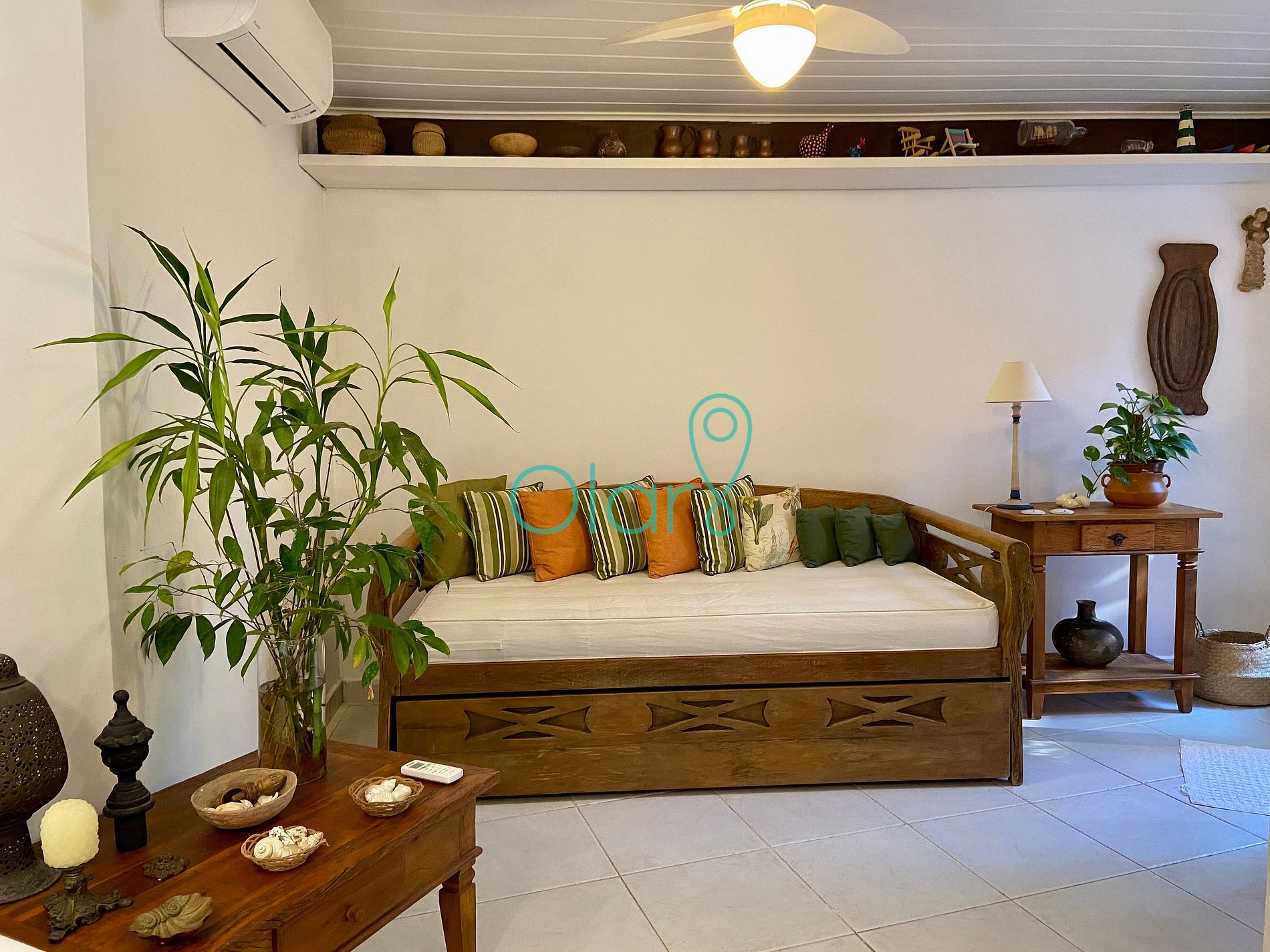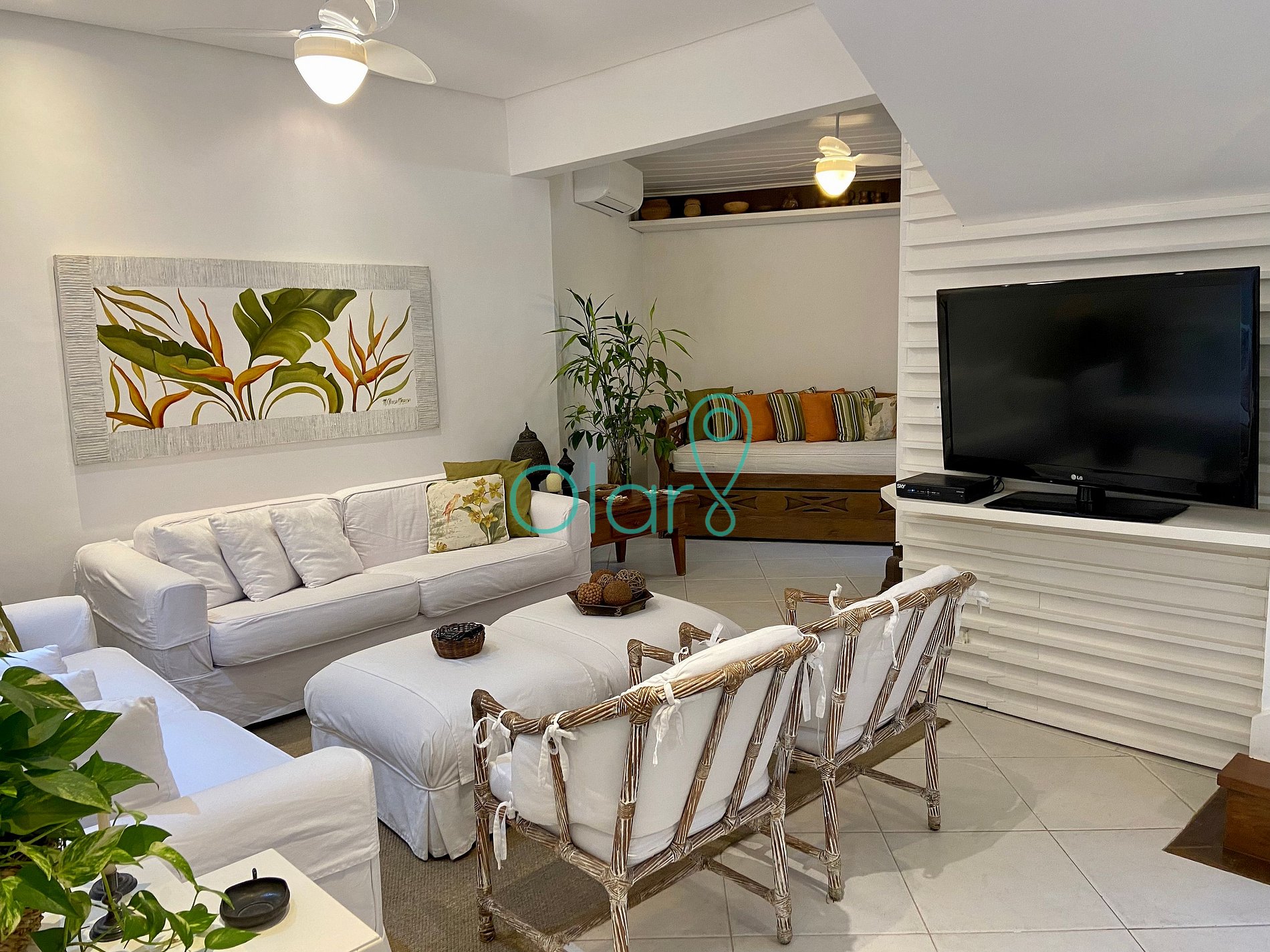 Sala de TV: ventiladores de teto, ar condicionado, lareira, dois sofás de 2 lugares, 2 poltronas, sofá cama e TV.