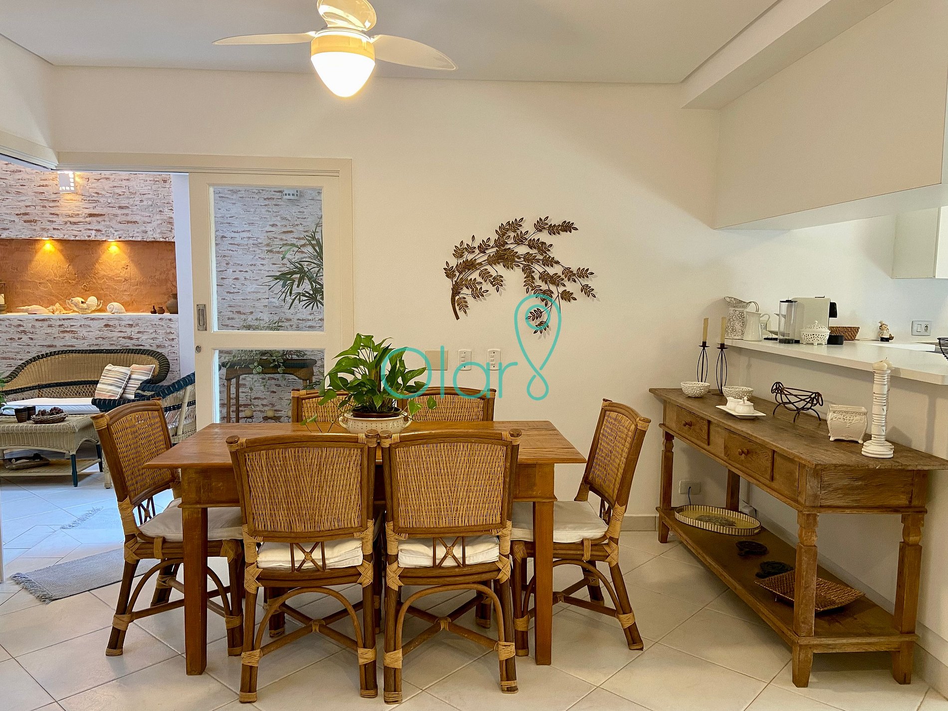 Sala de Jantar: ventilador de teto, mesa de 6 lugares e aparador.