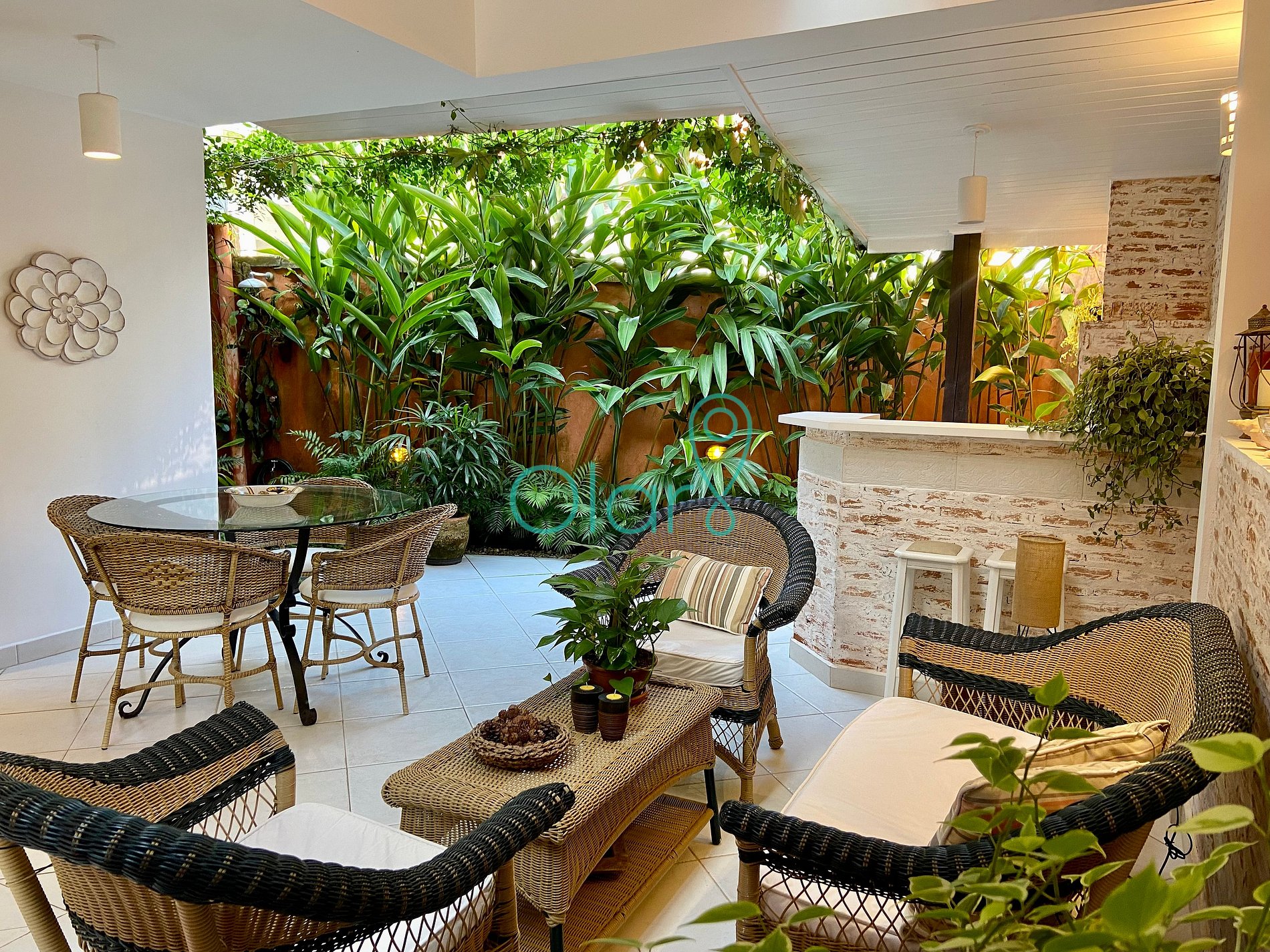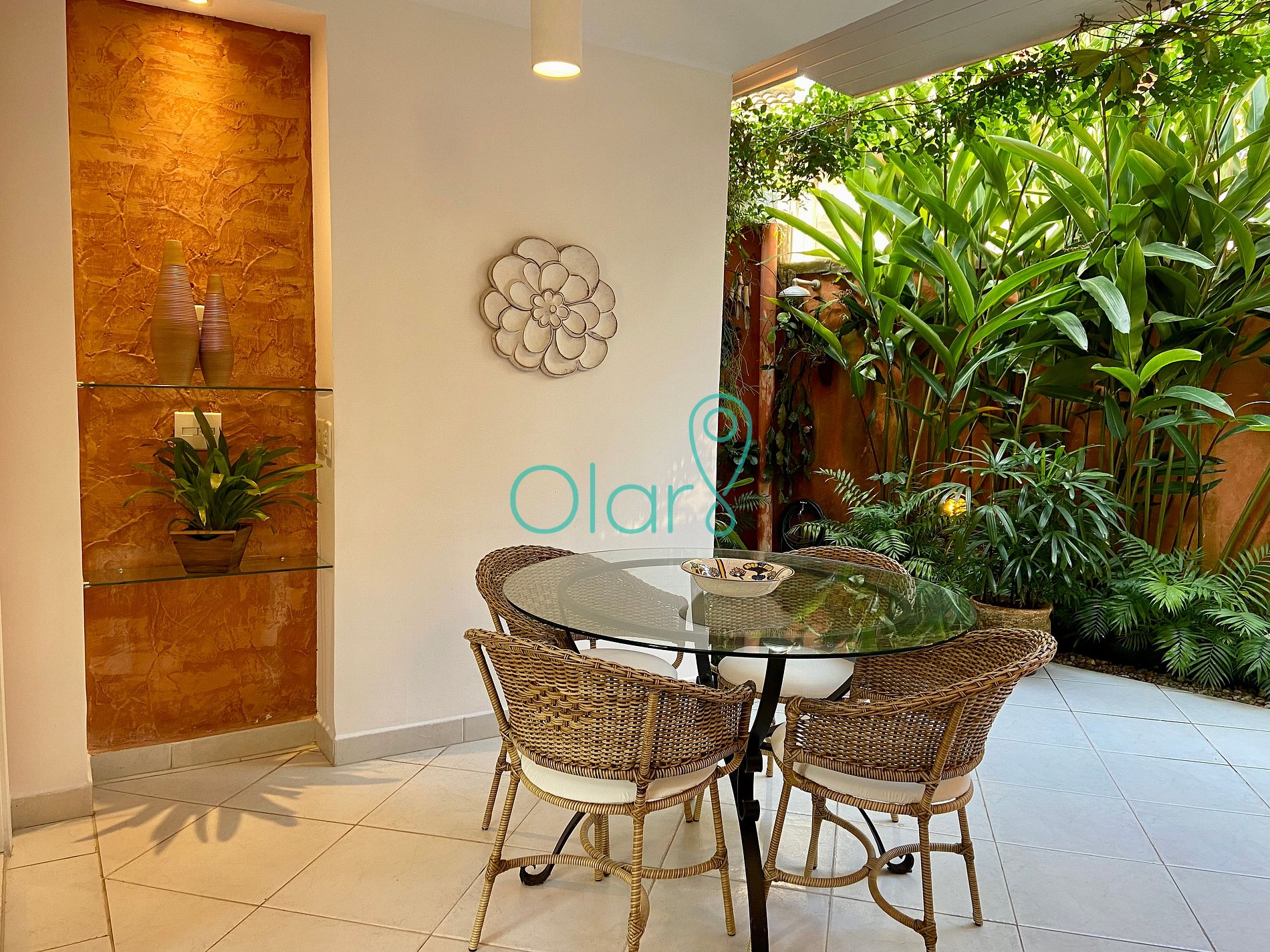 - Churrasqueira: bancada com duas banquetas e uma mesa de vidro com 4 lugares,
