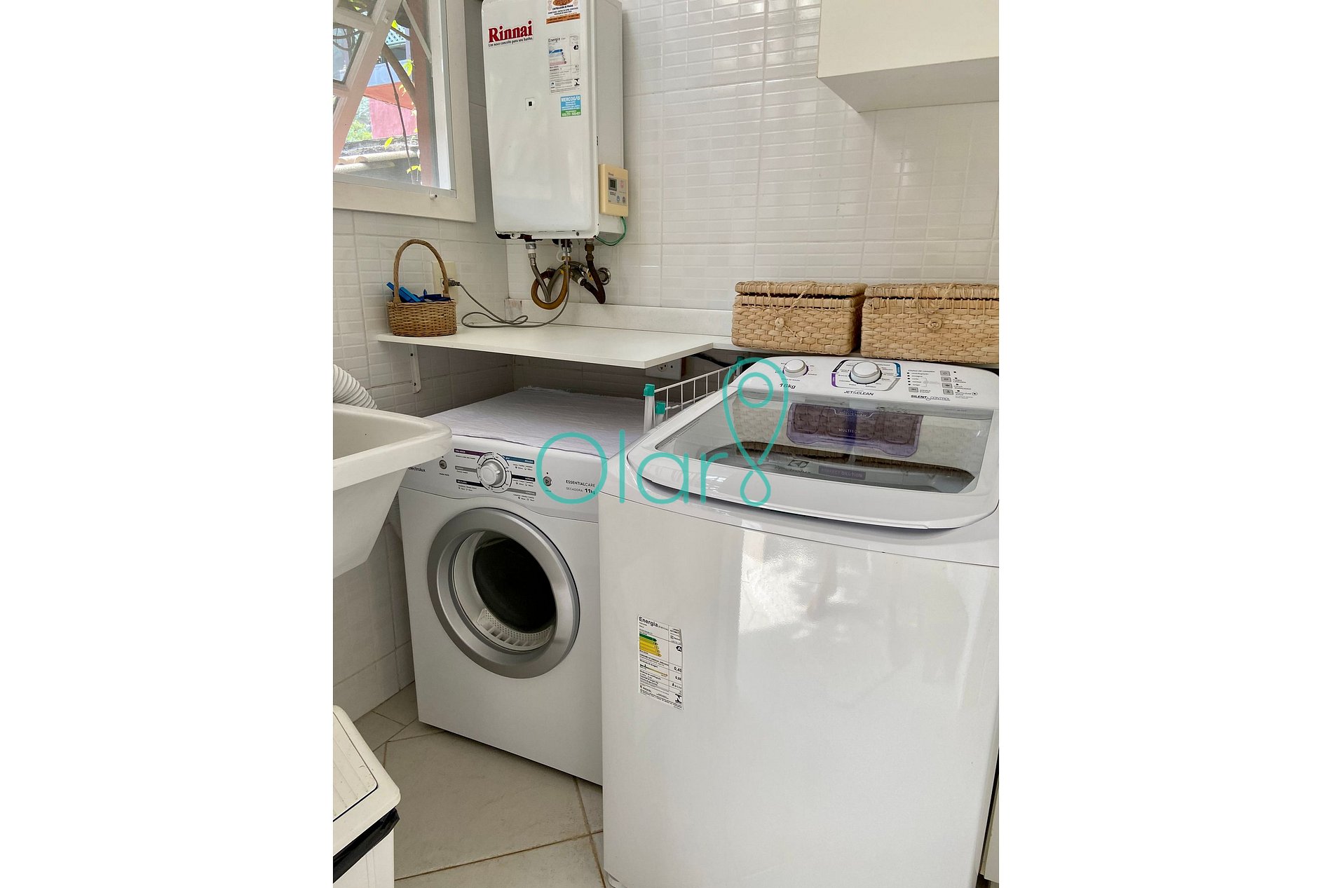 Cozinha: fogão, geladeira side by side, microondas, máquina de lavar louças, cafeteira nespresso, máquina de lavar e secar roupas. A casa possui louças, talheres e utensílios para atender até 7 pessoas hospedadas.