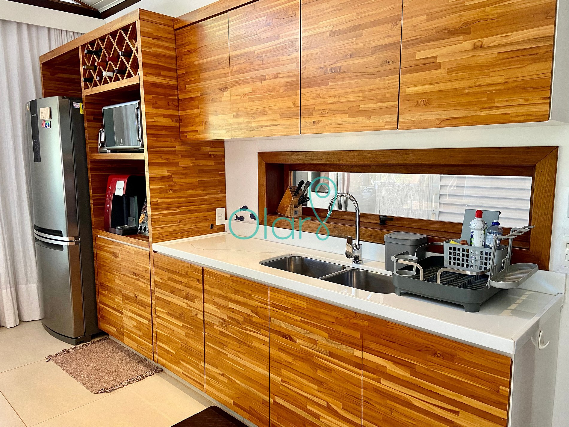 A cozinha é equipada com lava louça, duas geladeiras, filtro B.Blend Brastemp, cervejeira, fogão 5 bocas, coifa e microondas.