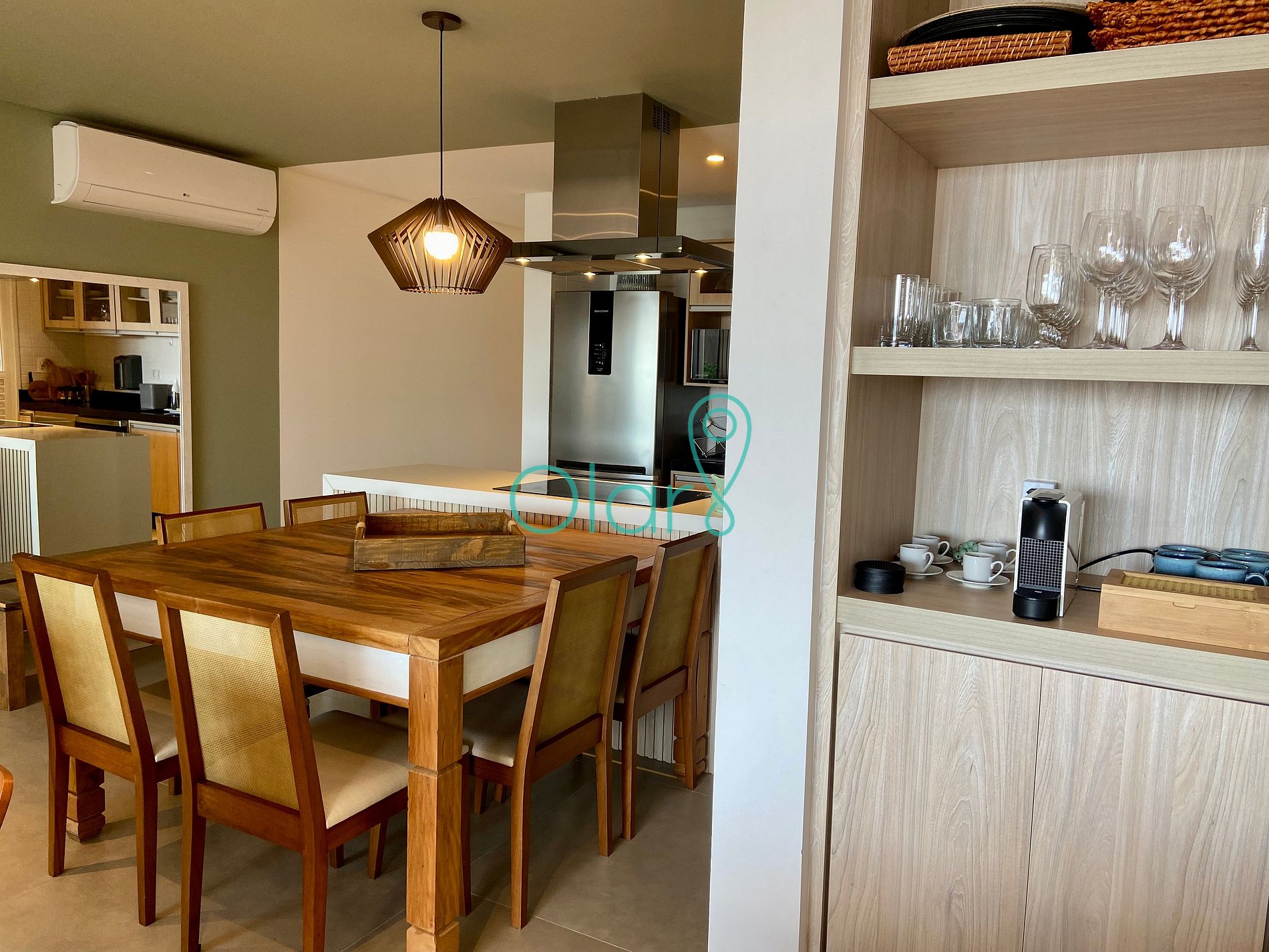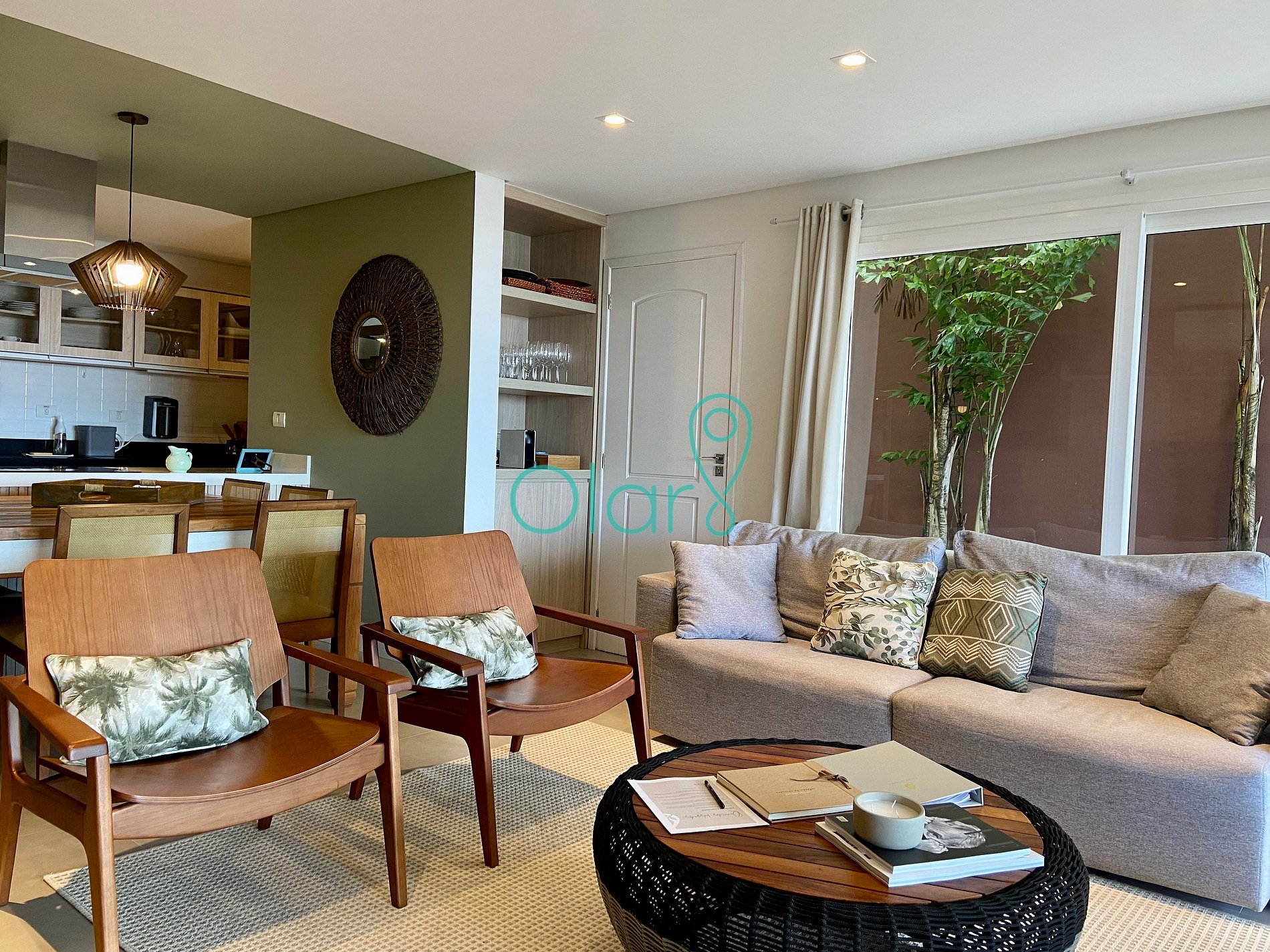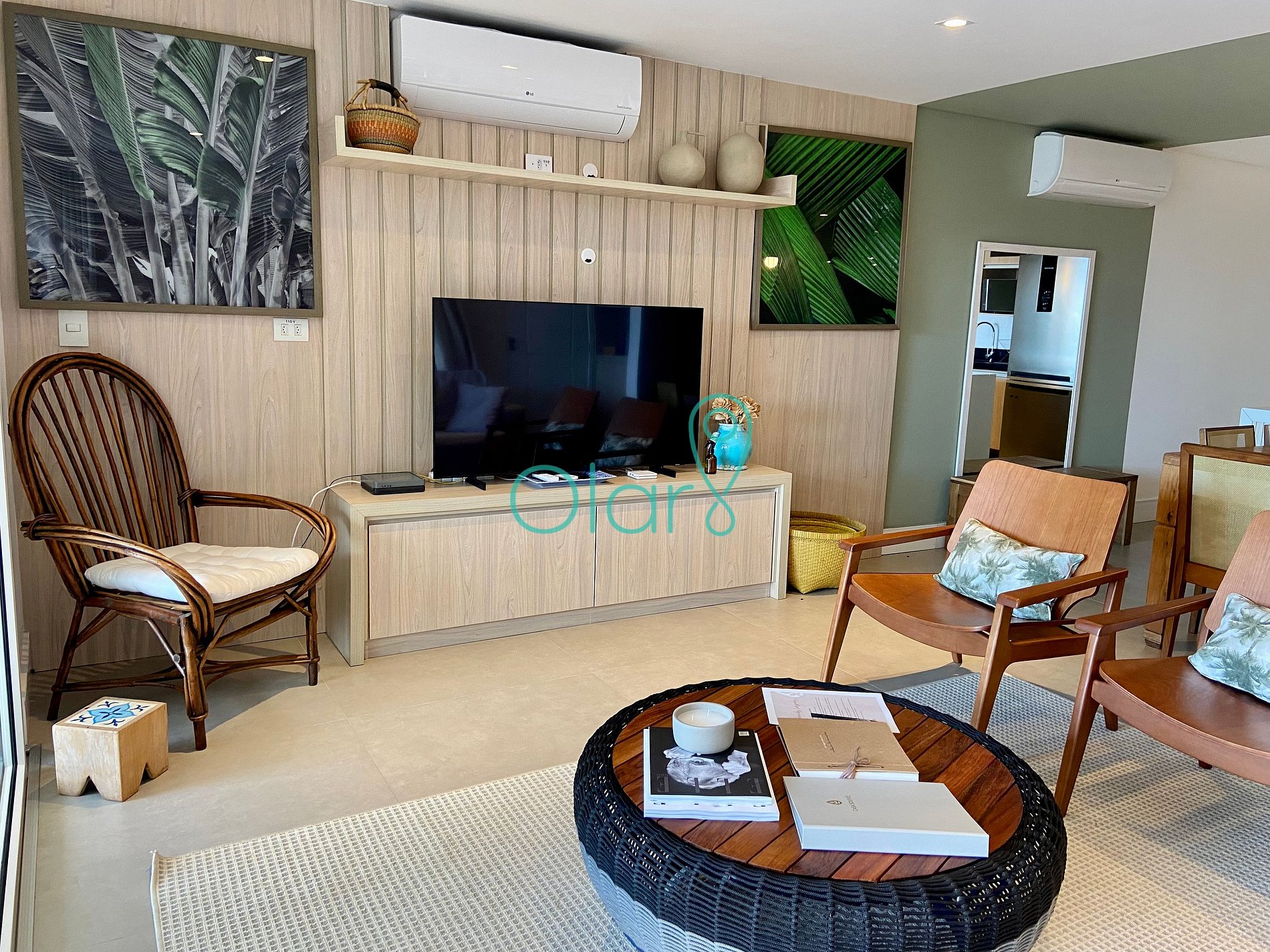 Sala: ar condicionado, mesa de jantar, smartTV, sofá 4 lugares, 2 poltronas.