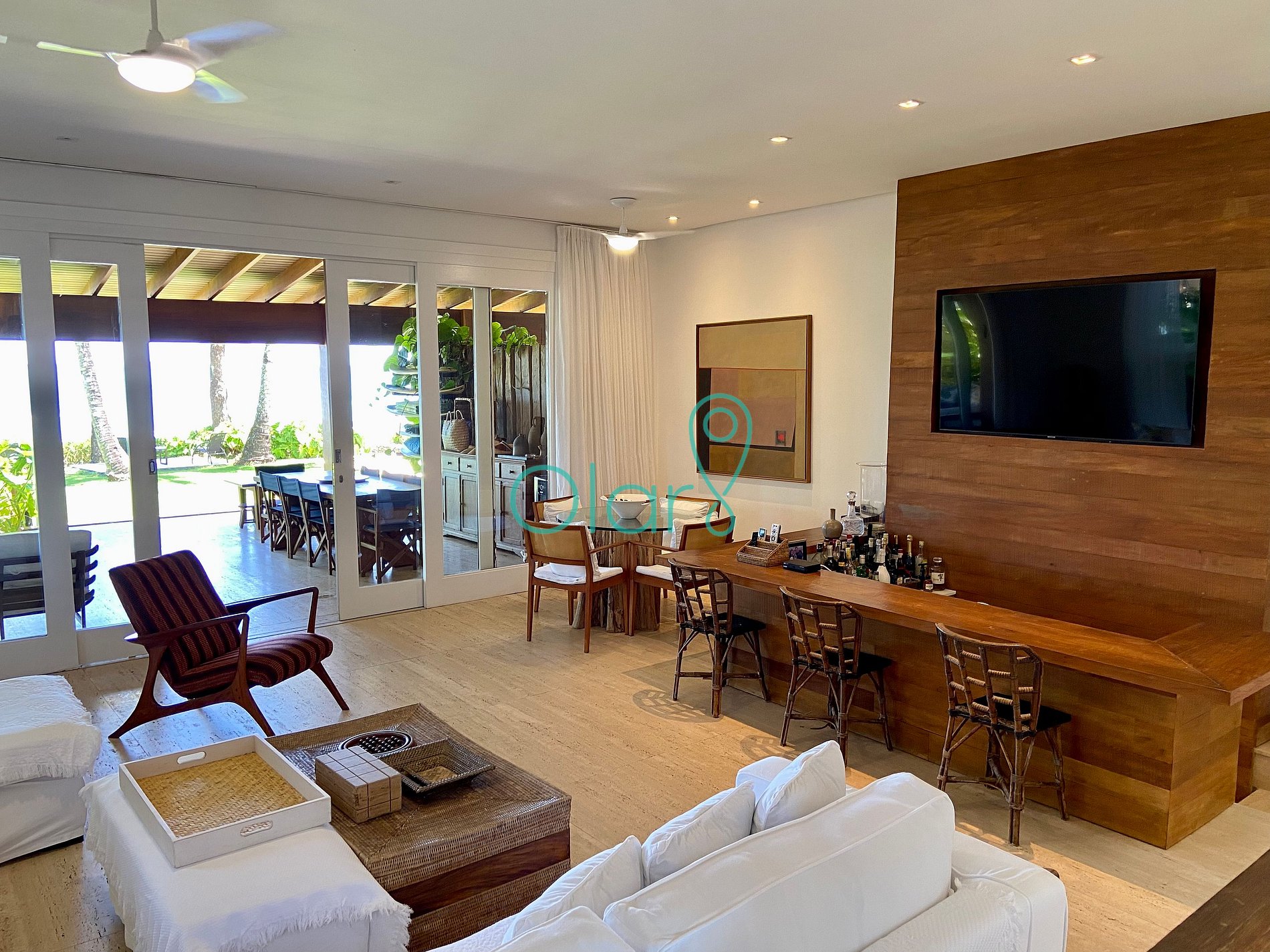 A sala possui 3 ambientes integrados: sala de jantar, bar e sala de TV, com uma abertura frontal para a varanda, com sofás, móveis e churrasqueira.